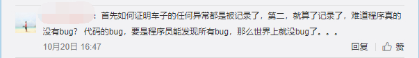 对于特斯拉的这一回复,网友们亦是用“甩锅”来形容。有网友评论:“首先如何证明车子的任何异常都是被记录了。其次,就算是有了记录,程序就真的没有bug? 要是程序员能发现所有bug,那么世界上就没bug了。”