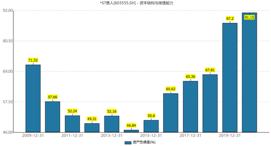 自上市以来,贵人鸟的资产负债率逐年升高。2014年公司资产负债率为46.84%,到了2019年该指标飙升至87.2%,远超同行。2019年李宁、安踏的资产负债率分别为43.22%、48.9%。