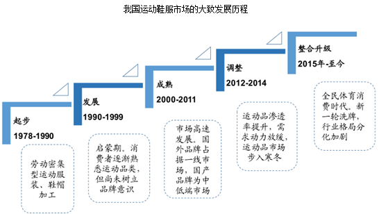 我国运动鞋服市场的大致发展历程主要分为:起步、发展、成熟、调整以及整合升级五个阶段。在经历2011年-2013年的滞涨期与衰退期之后,运动鞋行业在2014年-2015年重新恢复。