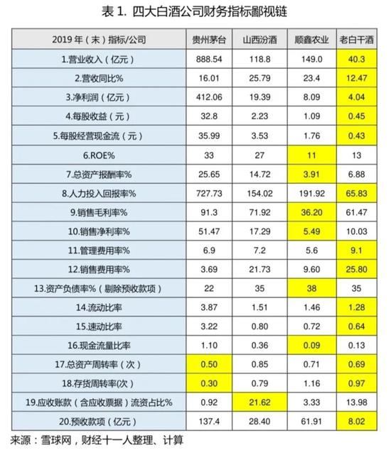 做事可以特立独行,但业绩要玩真章。下面,我们将贵州茅台、山西汾酒、老白干酒、顺鑫农业2019年的财务指标放在表1内,看看到底谁该鄙视谁。