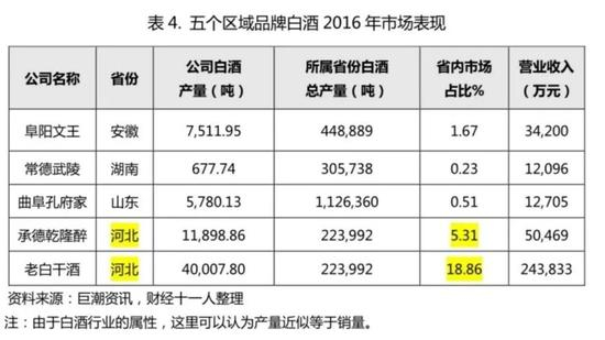 在河北本埠市场,老白干酒的市场占有份额一直不高,所谓“称霸”,只是口头爽利。在并购前的2016年,老白干酒在河北省的市场占有率只有18.86%(见表4)。