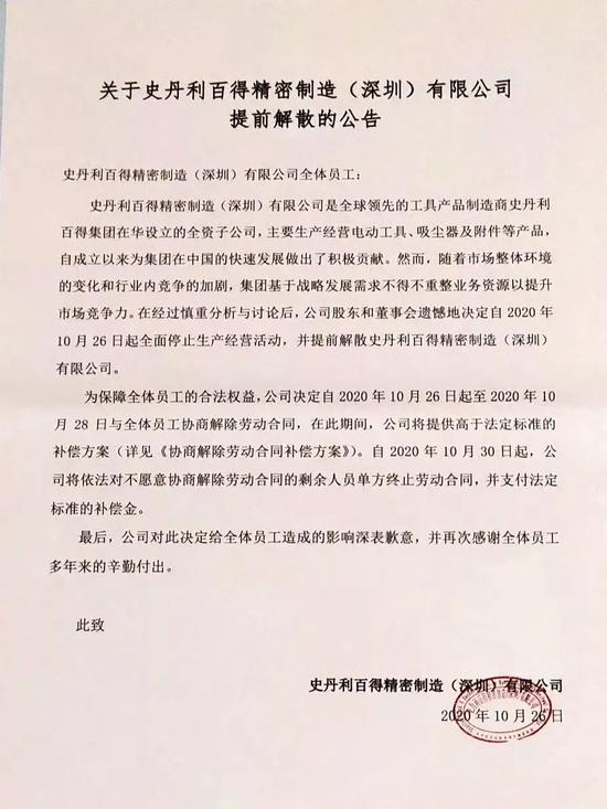 史丹利百得发布公告称,随着市场整体环境的变化和行业内竞争的加剧,集团基于战略发展需求,不得不重整业务资源以提升市场竞争力。在经过慎重分析与讨论后,公司股东和董事会遗憾地决定,自2020年10月26日起全面停止生产经营活动,并提前解散史丹利百得精密制造(深圳)有限公司。