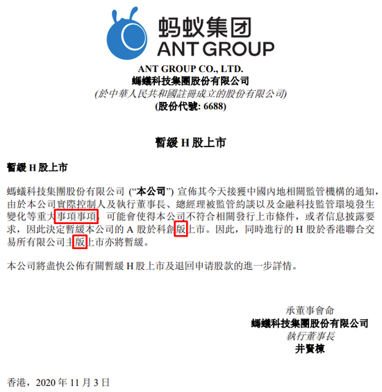 一切发生得太快,以至于蚂蚁在港交所发布的公告都出现了“口吃”和错字。