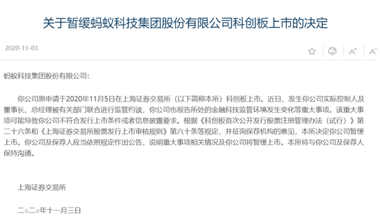 上交所发布公告,暂缓蚂蚁科技集团科创板上市,不到1小时后,港交所跟进公告,亦是暂缓,而这一切距离蚂蚁A+H正式上市不到3天。