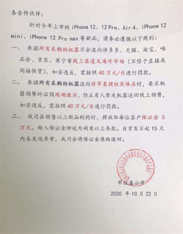 10月23日,根据蓝鲸财经报道,苹果的一家线下经销商通知合作伙伴,针对刚刚上市的iphone 12系列新品,禁止流向拼多多、天猫、淘宝、苏宁、京东、唯品会等线上渠道以及海外市场,否则需要按照每台40万元进行罚款。