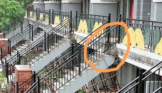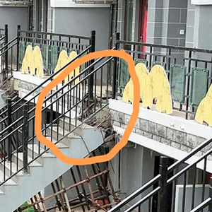 维权过程中,一名长城源著业主崔女士表示,由于家里进门处的楼梯陡峭,崔女士的母亲2017从楼梯口摔了下来,脚裸大面积淤青。由于长城源著的楼梯直接面对围墙,楼梯口到墙壁不到一米的距离,四面无路,出行极不方便,崔女士费很大力气才将老人搀扶就医。此后,崔女士家门口的楼梯又发生断裂。