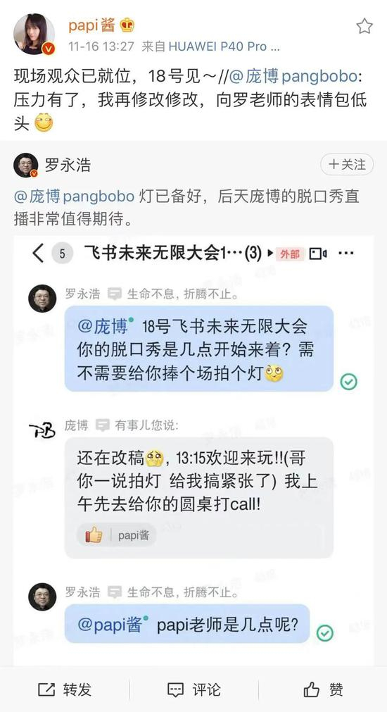 今天下午,罗永浩在微博上po出了跟庞博、papi酱在飞书上的沟通页面。三个人的聊天群显示,即将在18日“2020飞书未来无限大会”上表演脱口秀的庞博依然在改稿,拖稿人设丝毫不乱。从聊天记录来看,这或许是一场值得期待的表演,毕竟“集美貌与才华于一身的”papi酱在看了初稿后开怀大笑,提前预测庞博又要吸到新粉丝。