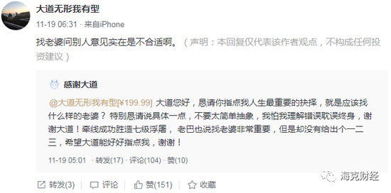 在雪球,问答有付费功能,每天有不少人花199.99元向“大道无形我有型”请教,这是段永平的网名。他喜欢网友叫他“大道”,而不是什么总,或老段之类。提问方向五花八门,该不该买这只股,怎么看某公司发展,该不该继续待在不喜欢的公司,自己一直在做错的事怎么办;慢慢地,提问范围甚至扩大到了家庭情感领域,有人开始问他找老婆的标准是什么,要不要生二胎。当然,更有许多人,并没有什么要问的,而是直接打赏,以示对多年来受教的感谢。