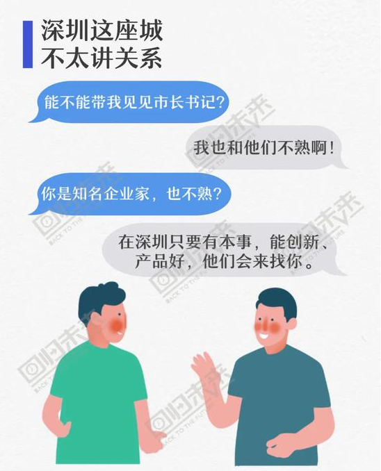 我说,我跟书记、市长也不熟,而这恰恰是我建议你们去深圳的原因,在深圳,你不需要和领导熟,只要你有本事、有创新、产品好,书记、市长会主动找你、支持你。