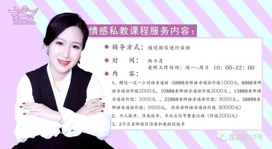 据此前媒体报道,机构创始人导师灵彤彤的一对一私教课程,一个月学费8万,一年学费高达58万。课程中包括该学院核心的“勾魂夺心36计”,“这是彤彤老师研究发明的,就是让男人离不开你的技巧”。