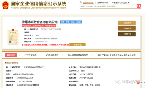 ▲徐州沐焱教育咨询有限公司注册信息。网页截图