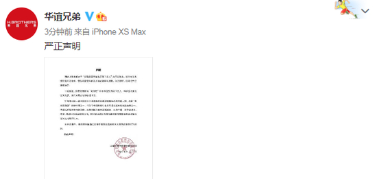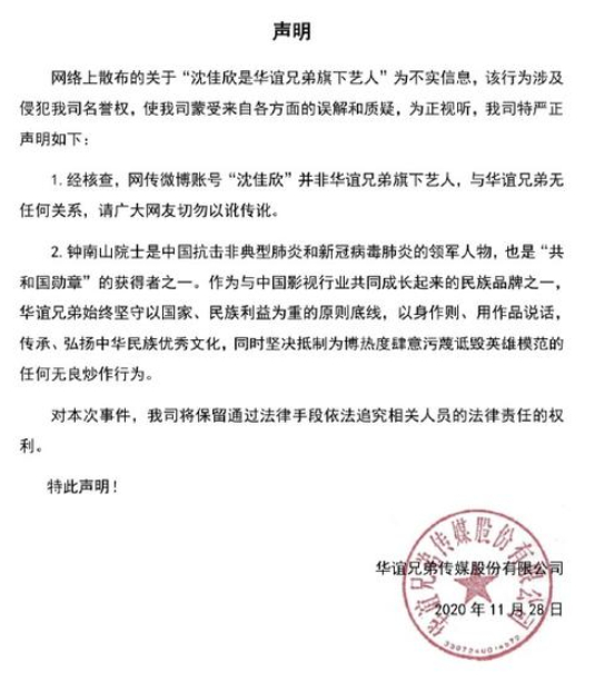 11月28日晚,华谊兄弟在社交平台发声明,否认沈佳欣是旗下艺人,并表示沈佳欣与华谊兄弟无任何关系。