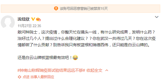 11月27日晚,网络用户沈佳欣在社交平台发言质疑钟南山院士,言语令人愤怒,目前该用户已因恶意营销被禁言15天。