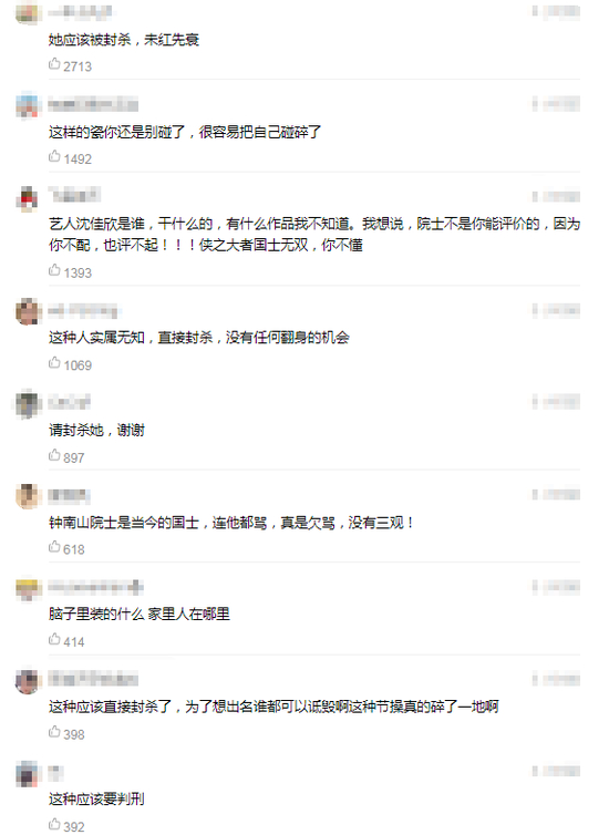 沈佳欣的言论彻底惹怒网友,纷纷留言应该封杀这种艺人,并认为这种人太无知,钟南山院士是当今的国士,做出的贡献有目共睹,而这位沈佳欣无底线博关注的行为,封禁15天的惩罚显然太轻了。