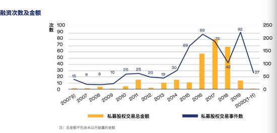 电影创业公司(未上市或融资时未上市)私募股权融资金额在2016年迎来了快速增长,2017年到达顶点,随后的快速下跌似乎印证了“影视寒冬”的到来。