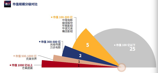 从个股市值规模来看,在这34 家A股企业中,市值超过1000亿的有1家,市值不足 100亿的则有25 家,占比达73%,其中横店影视市值在今年上半年刚刚突破100亿大关。