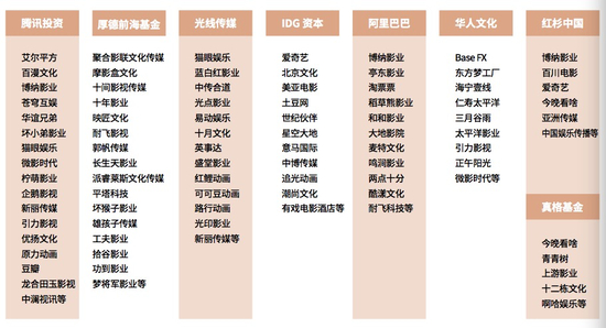 《中国投融资报告2020》显示,在电影行业进行股权投资次数位居前列的机构依次是腾讯投资、厚德前海基金、光线传媒、IDG 资本、阿里巴巴、华人文化、红杉中国和真格基金。其中腾讯投资了包括博纳影业、华谊兄弟、猫眼娱乐、微影时代、柠萌影业在内的17家影视类公司,厚德前海基金投资了耐飞影视、郭帆传媒、坏猴子影业等16家影视公司,光线传媒投资了猫眼娱乐、可可豆动画、新丽传媒等13家影视公司。