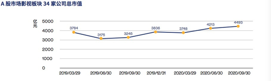 在A 股市场的市值分析方面,整体来看,2019 年与2020年影视板块公司表现低于市场整体水平。34家A股上市公司总市值呈现“先抑后扬”的趋势,自2019年3月的3784.05亿元,后于今年9 月增加至4492.69亿元,统计期间的18个月内总市值增加708.64亿元,增幅18.73%。