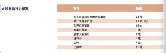 根据《中国投融资报告2020》,并购一般情况下会提高行业集中度,加快资源整合速度,有利于我国影视行业发展。截至2020年9月30日,A股市场从2019年1月以来发生与上市公司关联的并购行为23次,其中公布交易金额的有16笔,公开交易总价值为43.27亿元。其中,已完成的并购11笔, 董事会备案、股东大会通过和进行中的有8笔,其余4笔为并购失败。