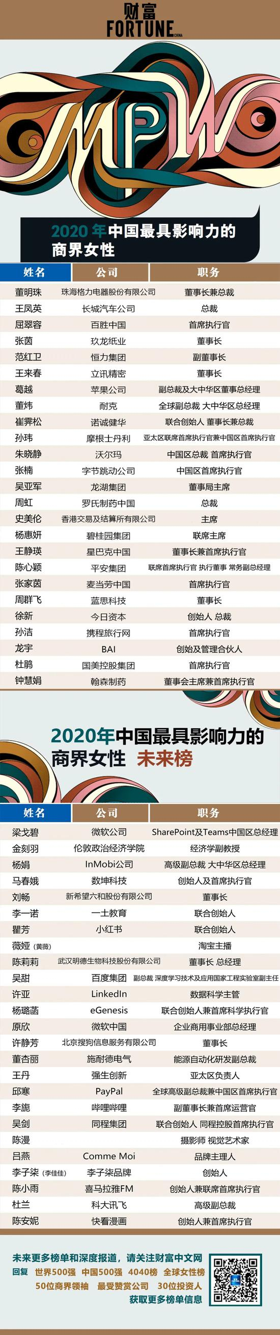 在商业世界中,有越来越多表现卓越的女性领导者在不断冲破因为性别而产生的天花板或边界,获得更为广阔的事业空间,同时为世界做出令人瞩目的贡献。特别需要提及的是,今年在应对新冠肺炎疫情这一黑天鹅事件的过程中,同样有许多女性领导者表现出了令人骄傲的智慧、勇气和坚持,我们以这份榜单向她们致敬。