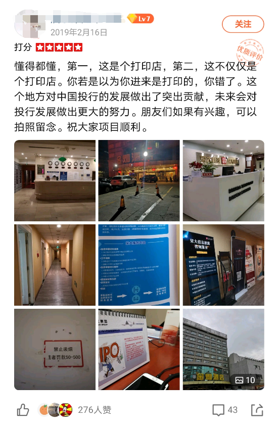 虽然记者未能核实到该数字的真实性,但根据荣大集团的公司介绍,其拥有97%的市场占有率,得到近百家券商及企业的认可。而在某生活服务APP上,有关金灿酒店这家荣大快印(也有点评软件将其显示为“荣大商贸”)点赞最多的一条评论,或一定程度上道出了投行人对荣大的评价和特殊情感——“第一,这是个打印店;第二,这不仅仅是个打印店。你若是以为你进来是打印的,你错了。这个地方对中国投行发展做出了突出贡献……祝大家项目顺利。”