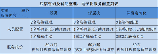 根据荣大快印员工同步给客户的一份服务介绍和价目单,这家打印店所从事的内容似乎已不能被简单理解为“资料打印”。用公司内部的说法,其业务全称为“底稿咨询及辅助整理、电子化服务配置”。具体来讲,包括底稿完整性和规范性处理、装订和扫描等基础的工作;更专业的则有法务资料、财务资料和业务资料的辅助搜集等,并提供各类修改建议。而根据项目的区分,公司还为客户提供了不同人员数量的咨询经理、整理组长/助理经理和底稿专员。