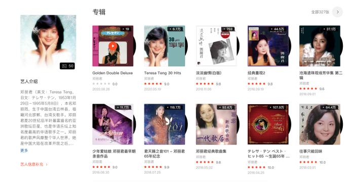 邓丽君的曲库就是我2013年整理的。那是个大工程,很多资料当时其实蛮难找的。整理了将近一个月,联系了好几个君迷才一起完成。现在虾米的邓丽君条目(327张专辑)大部分是我们那时候梳理出来的。