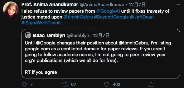 人工智能机器学习领域里的科学家们表示将拒绝帮谷歌审核论文,直到谷歌改变对前AI伦理团队联合负责人Timnit Gebru的立场。
