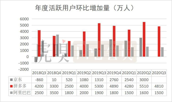 此外,在用户增长方面,还要面对竞对拼多多的步步紧逼。据拼多多2020年三季度报显示,拼多多年度活跃用户环比增加4810万人,远高于阿里同期的1500万。年度活跃买家达到7.313亿,距阿里的7.57亿相差无几。