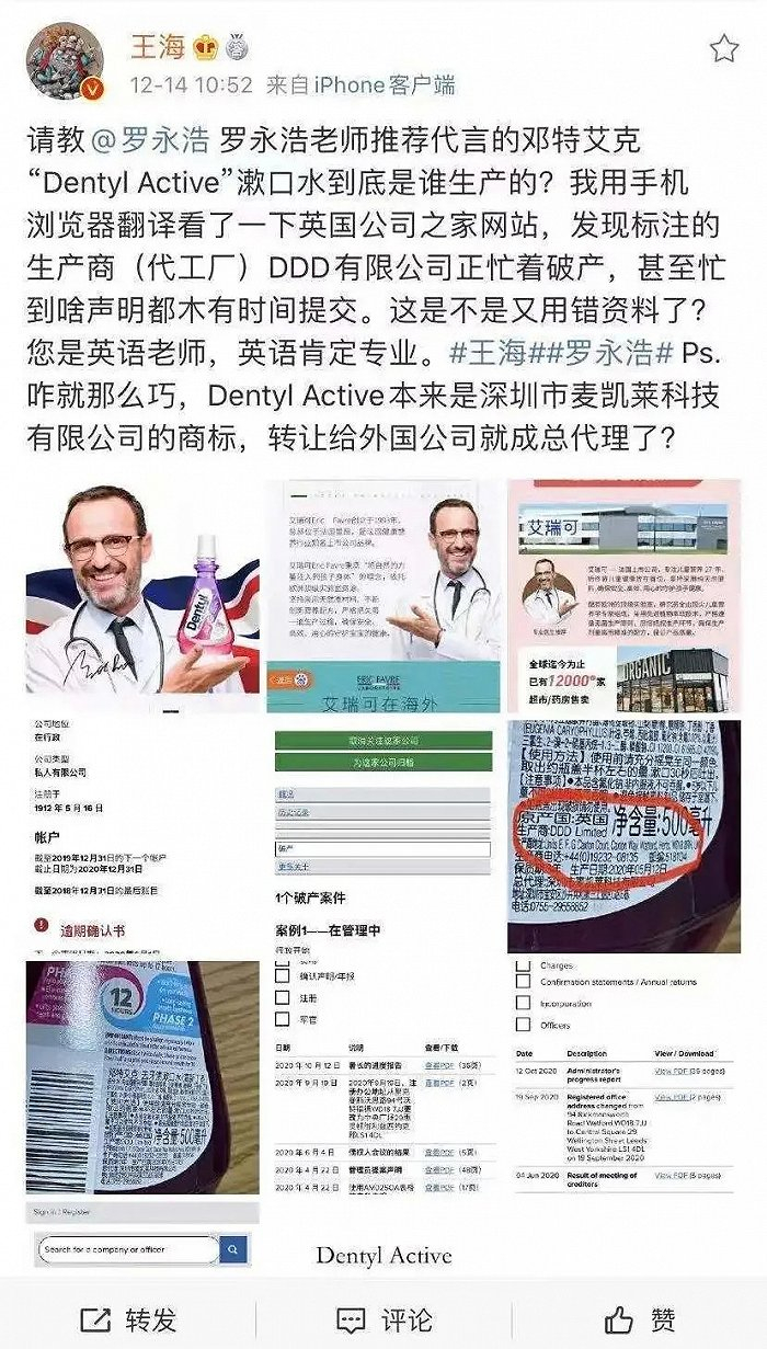 王海方面还指出罗永浩带货的“邓特艾克”漱口水涉嫌虚假厂名厂址、假冒进口商品,作为英语老师的罗永浩显然知情,这是在有意坑骗消费者。搜索应用上显示,邓特艾克品牌是由深圳麦凯来科技有限公司申请注册。