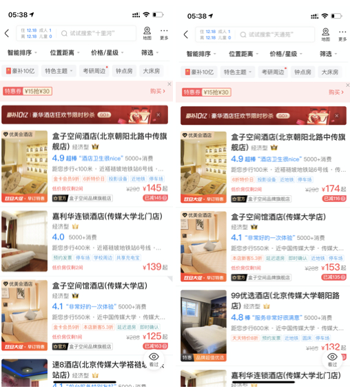 两个账号在几乎同一时间预订同一间酒店时,长时间使用的充值会员账号比较少使用的非会员账号贵出20多元。并且关键的是,该低频使用的非外卖会员账号,近3个月内有预订酒店记录,另一高频使用的外卖会员账号,从无酒店预订记录,但最终呈现价格依然是高频外卖会员账号价格高。