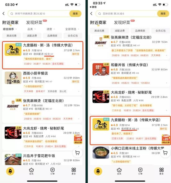 短时间内的两起相似案例,使得漂移神父认定此为美团平台的大数据杀熟行为。并且在之后的多次测试中,他还发现一部开通美团外卖会员的手机,附近几乎所有外卖店铺的配送,基本都要超出非会员1-5元不等。