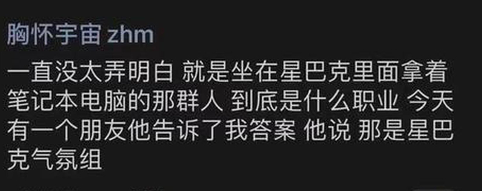 日前,有网友在朋友圈笑称“一直没太弄明白,就是坐在星巴克里面拿着笔记本电脑的那群人到底是什么职业,今天有一个朋友他告诉了我答案,他说,那是星巴克气氛组”。