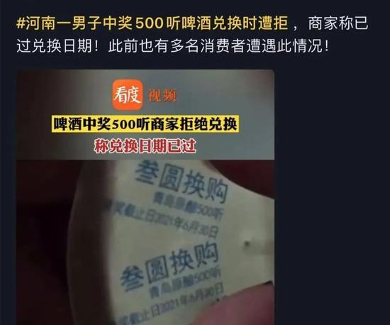 事情要从两天前说起。12月20日,河南南阳的李先生在饭店吃饭时,发现买的崂山啤酒中奖了,中奖信息显示“3元换购青岛原酿500听”。当时,李先生看到,活动截止到6月30日。