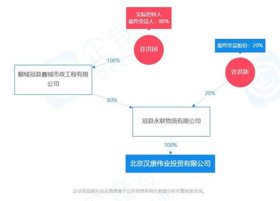 汉唐伟业目前的注册资本为2.125亿元,由冠县永联物流有限公司(简称“冠县永联”)全资拥有,从事商业地产开发及经营。向上溯及可以发现,该公司的实控人为许洪国,持有80%股份。