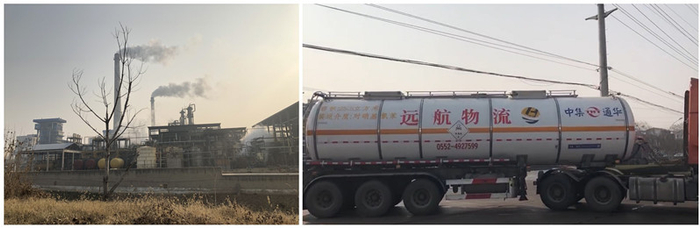 注:记者走访期间,八一化工冒烟的烟筒(左图)和对硝基氯苯运输车辆进出厂区(右图)