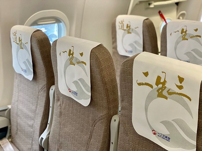 飞机采用90座全经济舱布局,共18排座椅“左二右三”座位布局,座椅选用国产最新的超薄型座椅,外观简洁,乘坐舒适,间距、后仰、宽度与东航现有单通道客机配置水平相当,同时,为每位旅客均提供了USB电源插口,客舱内饰风格与东航配置标准保持一致。
