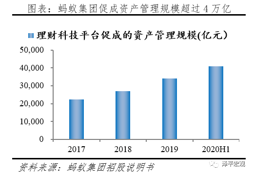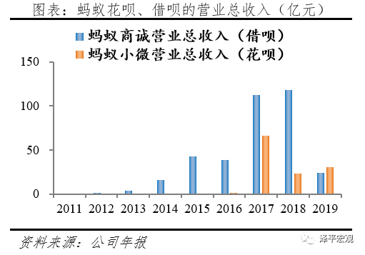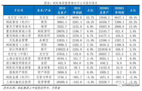 理财业务的经营主体主要是天弘基金和蚂蚁(杭州)基金销售。其中,天弘基金2019年和2020年上半年贡献净利润21.6亿元、12.9亿元,占比11.9%、5.9%。