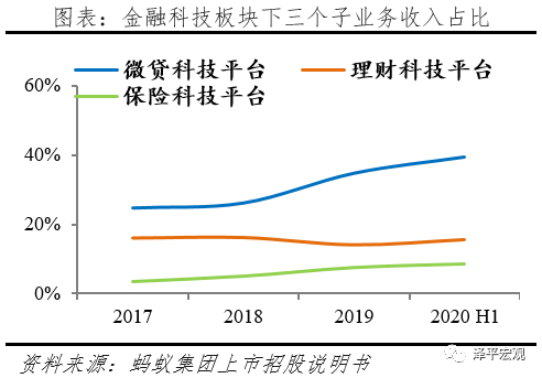 数字金融科技平台贡献收入64%,网络借贷占比高。此板块为多元金融服务,以交易佣金、利息收入、投资收益等作为主要收入,2017-2020上半年营业收入分别289.9、406.2、677.8、459.7亿元,占比从44.3%增长至64.4%,是蚂蚁最大的收入来源。下设微贷科技平台、理财科技平台和保险科技平台,2020年上半年收入占比分别为39%、16%、8%。