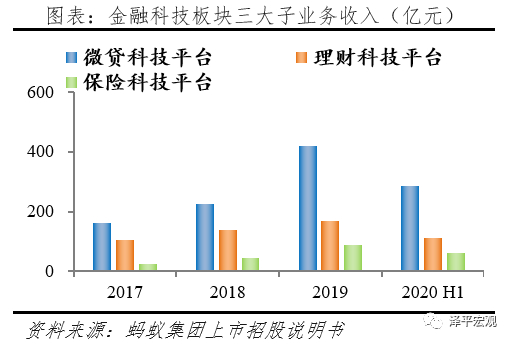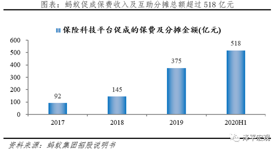 保险业务的经营主体是蚂蚁胜信(上海)信息技术和国泰财产保险,截至2020年6月底,蚂蚁集团负债中保险合同准备金达到15.4亿元,是2017年的1.3倍,2020年上半年蚂蚁胜信贡献净利润14.1亿元,占比6.4%。