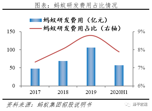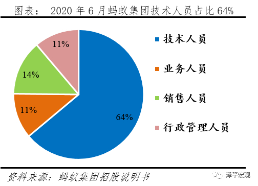 投入:蚂蚁集团不断加大金融技术创新投入,根据招股说明书披露,2019年集团研发费用高达106.05亿元,同比大幅增长53.6%,占总营业收入比重达到8.8%,截至2020年6月,蚂蚁集团技术人员共10646人,占总员工比重64%。