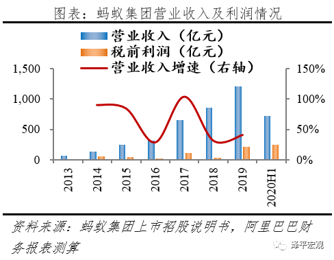 业绩大跨步迈进。尽管2017年前没有披露业绩,但根据蚂蚁和阿里巴巴技术服务费分成协议,2014-2016年的税前利润分别为56.56、42.54、29.06亿元。前期主要受销售推广拖累,利润表现一般,随着护城河壁垒形成,商业模式日渐成熟,业绩开始大跨步迈进。根据招股说明书,2017-2019年蚂蚁营业收入从653.96亿元升至1206.18亿元,年化增长率为35.81%;净利润从82.05亿元升至180.72亿元,年化增速48%。截至2020年上半年,蚂蚁营业收入725.28亿元,净利润219.23亿元,仅仅半年已经超过了去年全年利润。