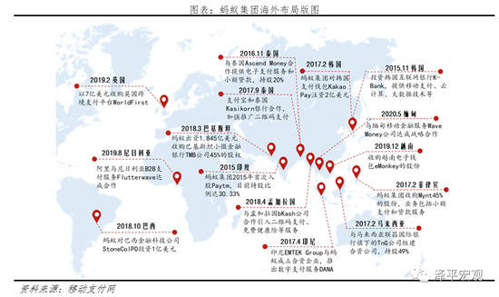 三是由点及面,蚂蚁集团依托以支付业务为先导,跟随阿里巴巴集团生态战略布局出海,延伸多元金融业态。蚂蚁集团海外布局试图复制支付宝在国内开创的“从场景到支付到金融”的发展路径,与阿里巴巴集团的国际化战略高度协同,例如2016年4月,阿里巴巴以10.2亿美元收购Lazada约54%的股权,同期蚂蚁金服宣布与Lazada旗下的在线支付工具HelloPay合并,后者将改名为“支付宝”,由此通过与阿里巴巴的应用场景绑定输出支付技术;2019年后蚂蚁集团开始从支付业务向多元金融转化,海外业务的深度进一步提升,例如2019年1月投资印尼消费分期公司Akulaku,2019年11月印度布局消费借贷产品Paytm Postpaid,2020年1月投资印度餐饮020企业Zomato等,开始从支付业务向零售行业及消费金融领域拓展。