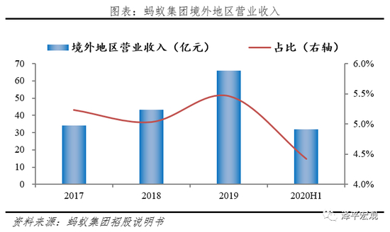 蚂蚁集团的海外布局开始于2015年,目前已在中国大陆、印度、巴基斯坦、孟加拉国、泰国、菲律宾、马来西亚、印尼、韩国、中国香港等全球10个国家和地区拥有本地电子钱包,形成“1+9”的布局模式,覆盖全球共12亿用户,境外用户近3亿。根据蚂蚁集团招股说明书,截至2020年6月止的12个月内,通过公司平台处理的国际总支付交易规模达6219亿元,2017-2020上半年境外地区营业收入分别为34.2、43.1、65.86、32.1亿元,占比5.23%、5.03%、5.46%、4.42%。