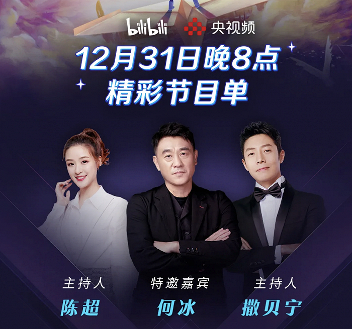 2020年12月30日,《2020最美的夜bilibili晚会》跨年节目单正式出炉。晚会将由中央广播电视总台主持人撒贝宁、湖北卫视主持人陈超、《后浪》演讲人何冰搭档主持。从节目单可以看出,周深将演唱《姜子牙》片尾曲、五月天唱《干杯》压轴。“最懂年轻人”的B站在官宣的节目单中还出现了经典IP漫威、仙剑奇侠传、英雄联盟等多样元素。