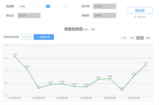 尽管其在11月恢复了月销万台的成绩,但捷途X70前11个月销量累计仅6.65万台,就算其12月超常发挥又怎么去弥补超过6万台的销量差距?诚然,今年新冠肺炎疫情的因素或多或少会对企业销量造成影响,但9个月的销量低迷未免有些过分。(销量数据来源:搜狐汽车)
