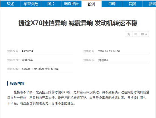除了悬挂异响,捷途X70还有变速箱异响、发动机转速不稳的情况发生。一位2020款1.5T手动悦行版捷途X70车主在投诉中表示:“挂挡难不平顺,尤其挂三挡的时候咔咔响,之前给4S店反映过,得不到解决。过烂路的时候前减震跟打鼓一样响,严重影响开车心情。最近发动机转速不稳,大夏天冷车启动转速过高,且持续时间久,不平稳。明显感觉到加速无力,给油不走的情况。”