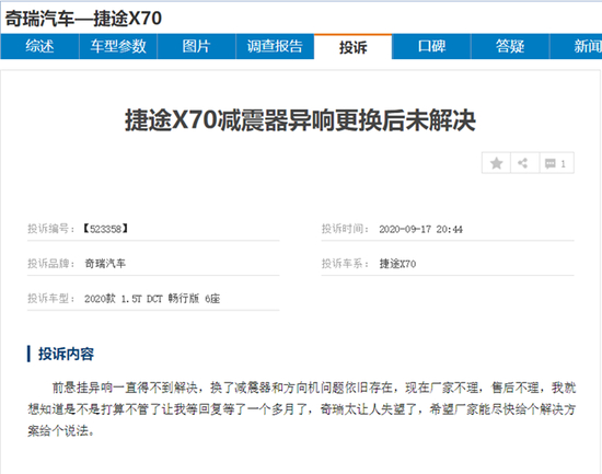 其中,在针对悬挂异响的投诉中,一位2020款1.5T DCT畅行版捷途X70车主张先生(化名)在投诉中表示:“前悬挂异响一直得不到解决,换了减震器和方向机问题依旧存在,现在厂家不理,售后不理,我就想知道是不是打算不管了,让我等回复等了一个多月了,奇瑞太让人失望了,希望厂家能尽快给个解决方案给个说法。”从该车主的投诉中不难看出,捷途的悬挂异响问题甚至已经让车主对整个奇瑞品牌都产生了怀疑。