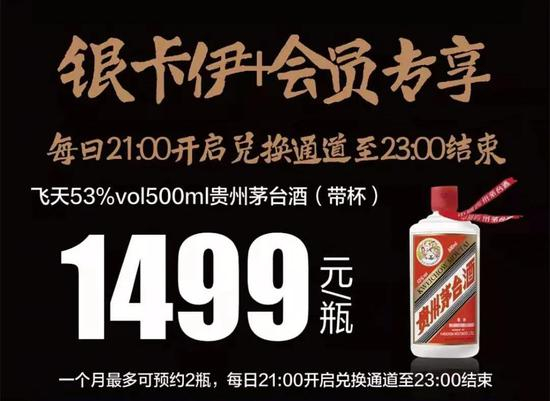 记者点击进入“银卡伊+会员专享”广告页面,看到“1499元/瓶”“飞天53%vol500ml贵州茅台酒(带杯)”字样和贵州茅台酒彩色图片占了整个页面的三分之一,非常醒目。据记者了解,市面上同类茅台酒价格要卖到每瓶2400元到2600元。但按如此优惠价格购买,必要满足诸多限制条件。这些条件虽然在同页面进行了告知,但字体极小,排列密密麻麻,很难阅读。