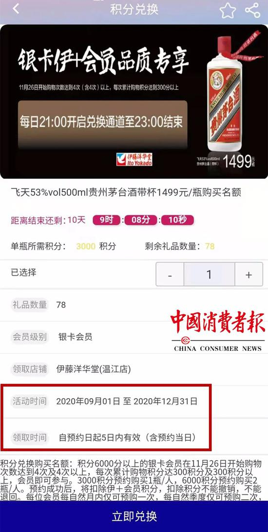 针对消费者反映的问题,12月29日,成都伊藤洋华堂有限公司回复记者称,活动性质是“积分兑换预约购买资格”,积分兑换了“预约购买资格”后,凭核销码到伊藤各店铺以1499元/瓶进行购买。为活动准备的茅台酒有数量限制,每天按计划具体数量兑换,并提前告知了消费者。